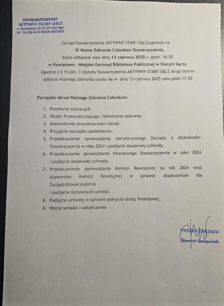 Zgodnie z § 15 pkt. 3 Statutu Stowarzyszenia AKTYWNY STARY SĄCZ drugi termin odbycia Walnego Zebrania ustala się w dniu 13 czerwca 2025 r.