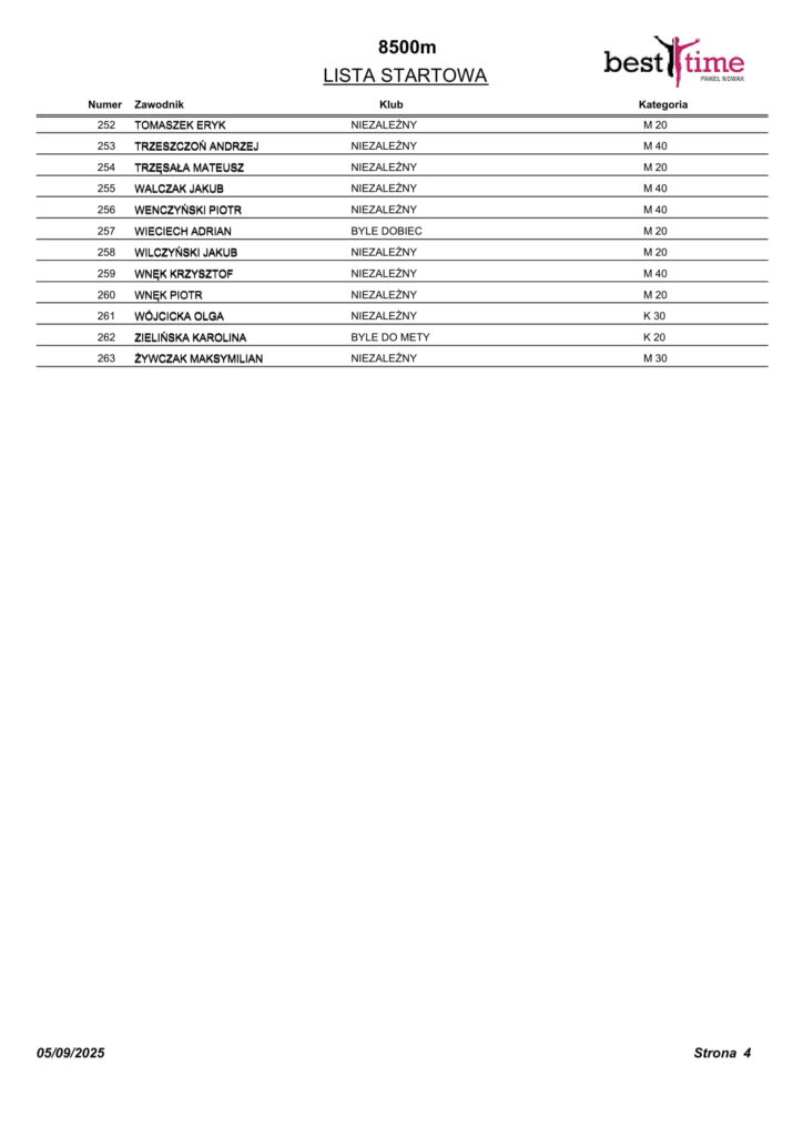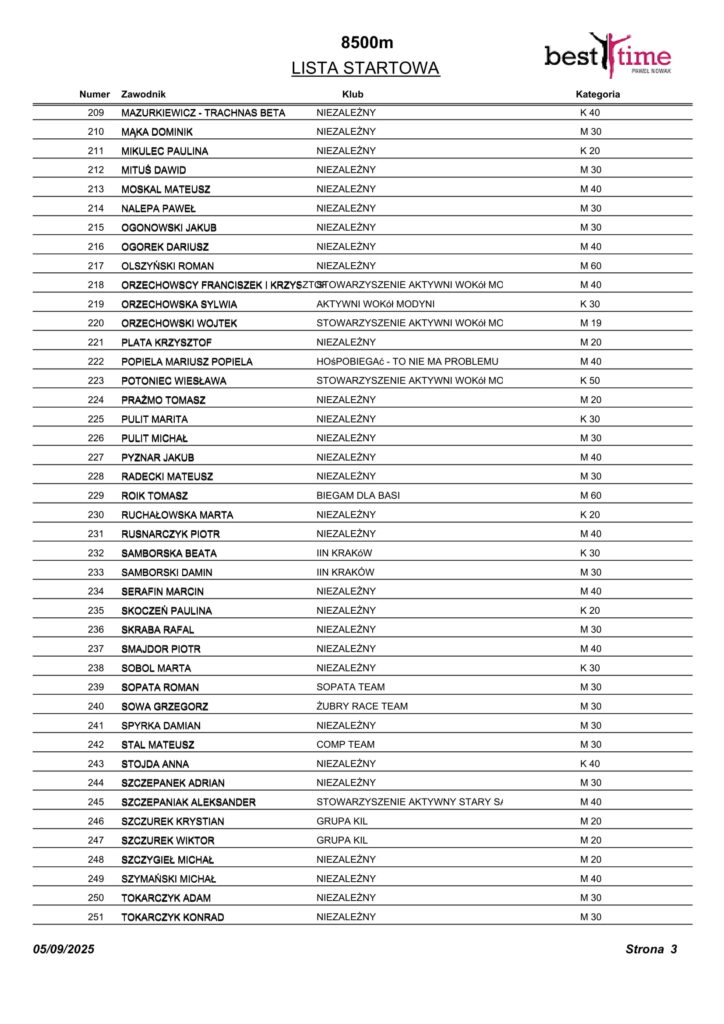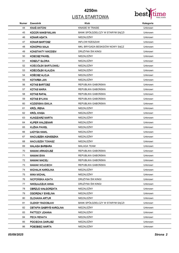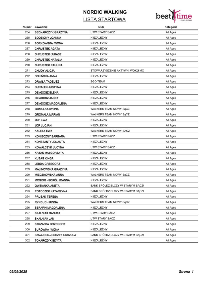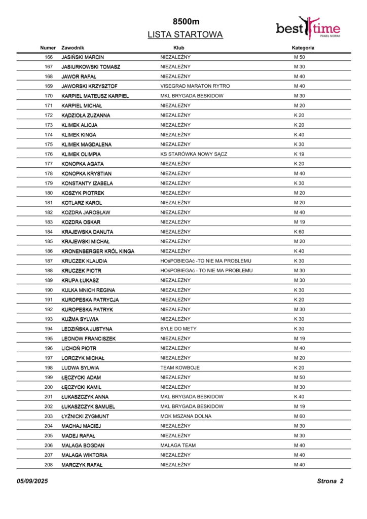 Listy startowe VII Bieg Nocny Św. Kingi w Starym Sączu 10.05.2025 r.