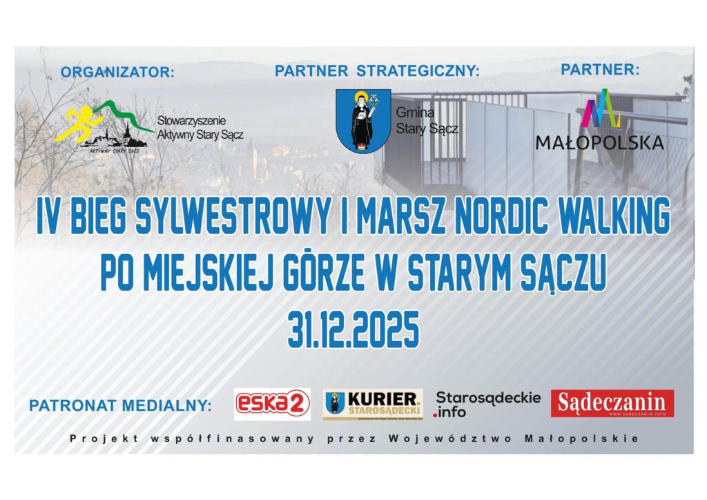 W ostatni dzień 2025 roku w Starym Sączu odbył się IV Bieg Sylwestrowy i marsz Nordic Walking po Miejskiej Górze. Na starcie zameldowało się 102 zawodniczek i zawodników z całej Polski ( Nowy Sącz, Niskowa, Podrzecze, Łomnica Zdrój, Tylmanowa, Limanowa, Gaboń, Warszawa, Stary Sącz, Kraków, Łukowica, Modlnica, Grybów, Mszana Dolna, Chełmiec, Podrzecze, Prochowie, Tarnów, Piastów, Paszyn, Brzezna, Szczereż, Tegoborze, Boguchwała, Łososina Dolna, Młyńczyska, Klucze, Kolbuszowa, Powrożnik, Bobrowniki Małe, Przysietnica, Dobczyce, Kluszkowce, Sosnowiec, Kozy, Jasło, Wola, Tarnobrzeg, Łącko, Olkusz, Mała Wieś, Pisarzowa, Kadcza, Łyczanka, Świniarsko, Kozienice, Barcice, Kobylany, Piastów.
